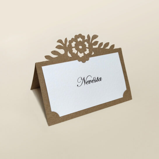 Jmenovky a označení stolů ve stejném stylu dokonalý celkový dojem. Můžete použít jemně vyřezávaný okraj nebo menší verzi hlavního motivu. Je to detail, který hosté ocení a který ukazuje vaši pozornost k celkovému designu svatby.